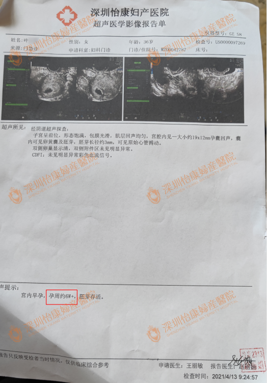 夫妻俩积极配合,女方在王丽敏主任帮助下,找准病因:双侧输卵管不全梗阻、粘连,盆腔子宫内膜异位症及黄体功能不全,进行宫腹腔镜微创手术+中西医药物调理,促排卵治疗。包先生在李海勇主任处就诊,针对性检查,诊断为弱精子症、左侧精索静脉曲张,中西药调理1个月。现查出怀孕6W+,可见卵黄囊、胚芽及原始心管搏动,宝宝发育正常。叶女士心里的石头落地了,特别开心!
